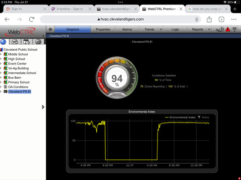 Through the past eight years of partnership, ES2 has helped the school district integrate seven campus buildings into a single building automation front end with Automated Logic’s WebCtrl. This allows Maintenance and Transportation Director Craig Ellis to monitor and manage his building portfolio on his iPad from anywhere. The automation system also helps the district reduce energy costs. For example, when the Bus Barn’s overhead doors are open, the system automatically shuts off the overhead unit heaters. This reduces energy costs by preventing the heaters from running when the hot air would just flow right out the open doors. Also, WebCtrl’s Environmental Index provides a quick snapshot on one screen, summarizing what portion of HVAC zones across campus have comfortable, satisfied environmental conditions.